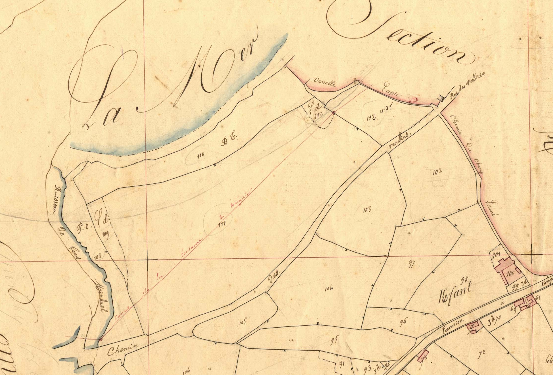 Extrait du cadastre ancien de Tréguier, section B dite de Saint-Michel, 1834 : emplacement du ruisseau de Goas Mickael et de la venelle Lapie (série 3P362)Immatriculation