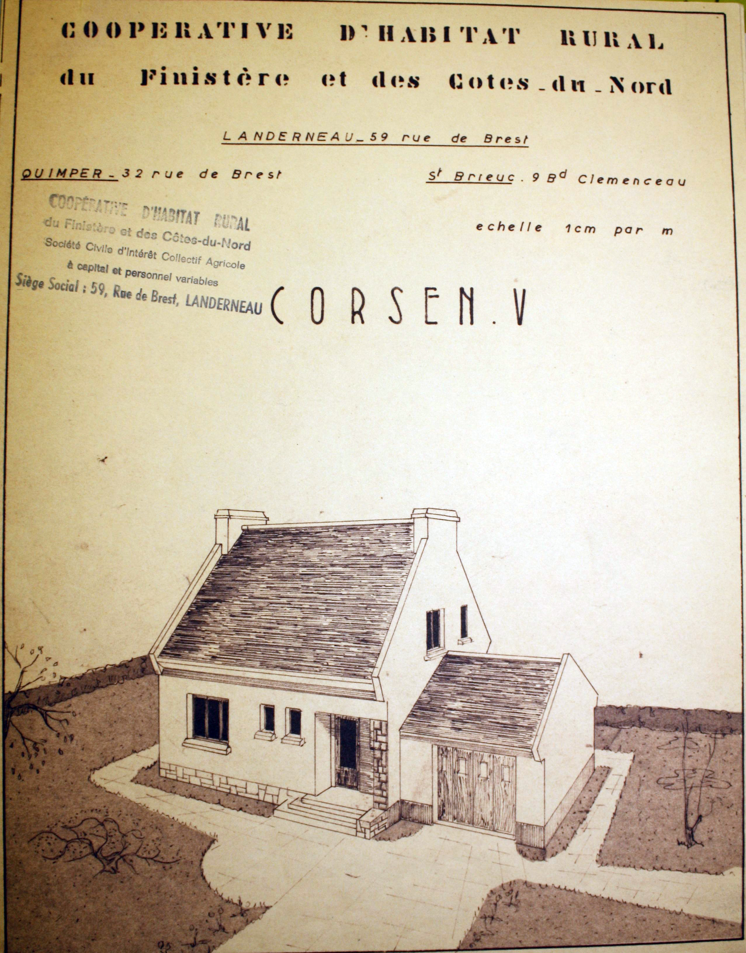 Tréguier : dessin de l'une des maisons proposées pour le lotissement Saint-Michel par la coopérative d'habitat rural du Finistère et des Côtes-du-Nord, modèle Corsen V (Archives municipales de Tréguier)Immatriculation