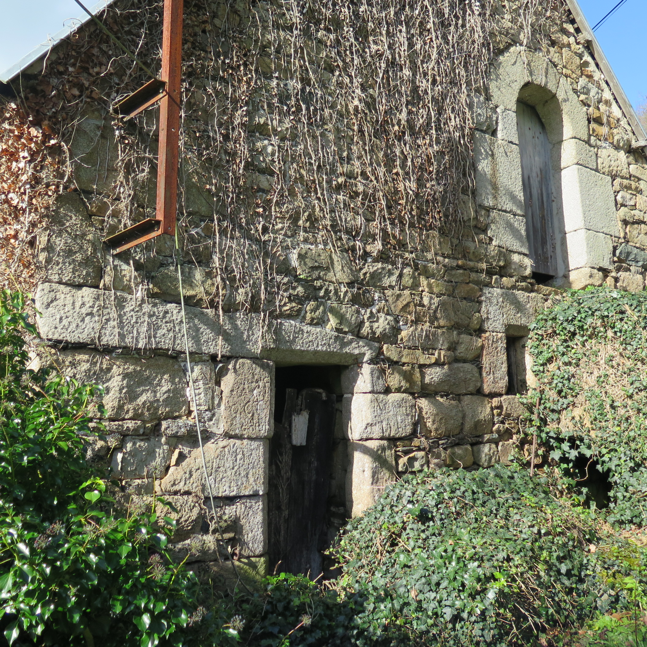 Moulin à farine. Pignon est. Détail du long bloc de granite à usage double de linteau et de pierre d'angleImmatriculation