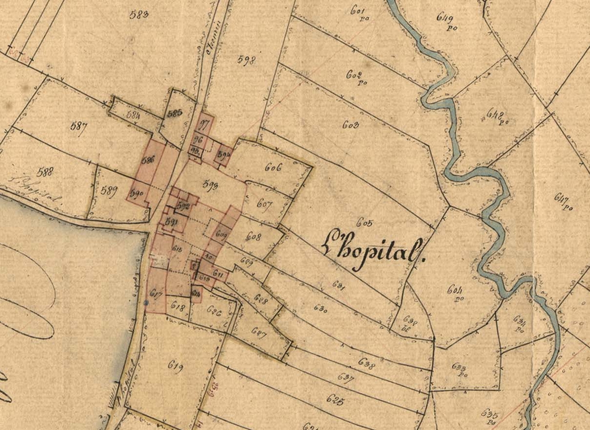 Extrait du cadastre de 1844 , section D, partie sud et est de l'écart de l'HôpitalImmatriculation