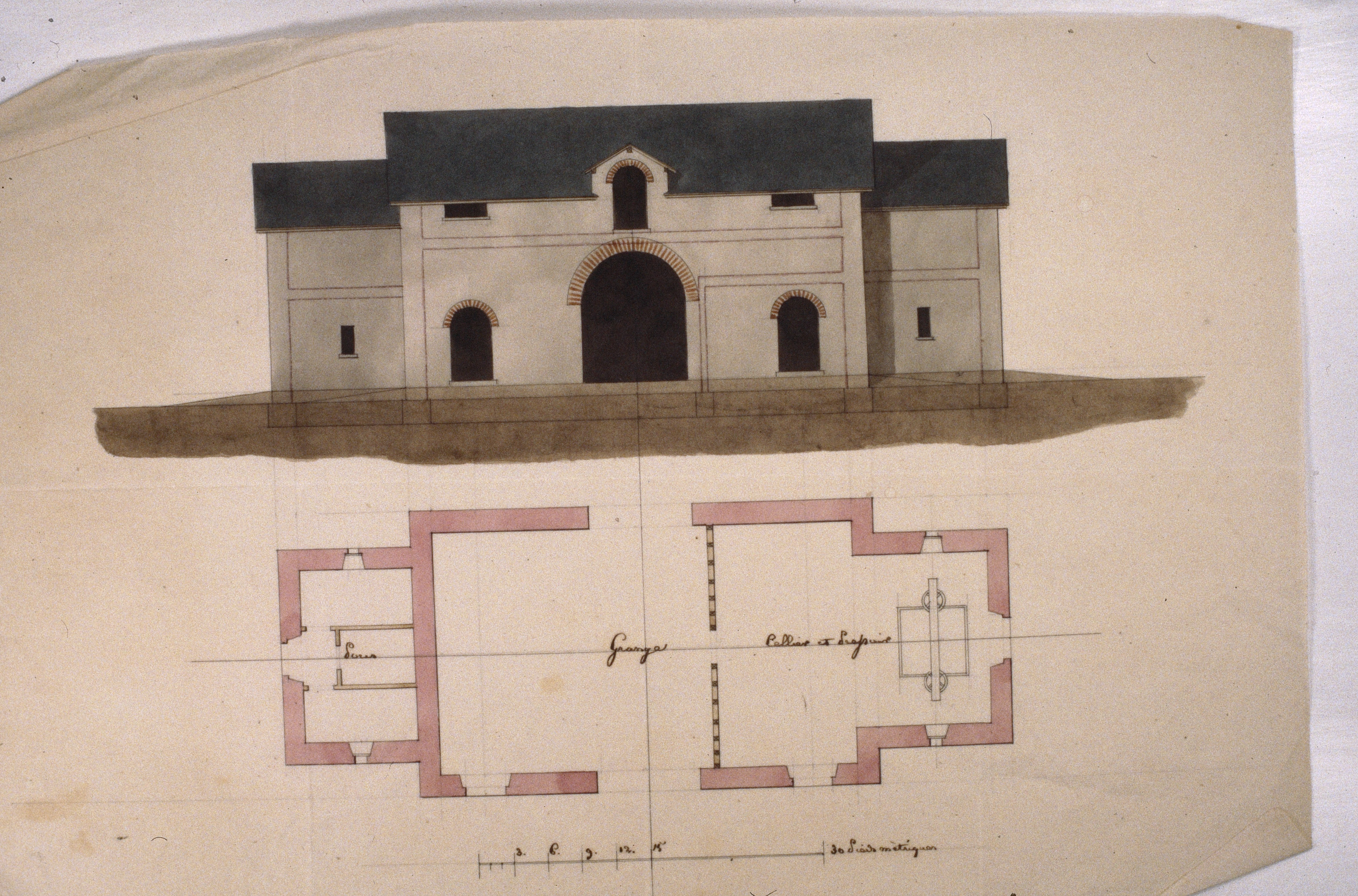 Plan d'élévation et plan au sol de la grange de la ferme de la Porte au château de LargentayeImmatriculation