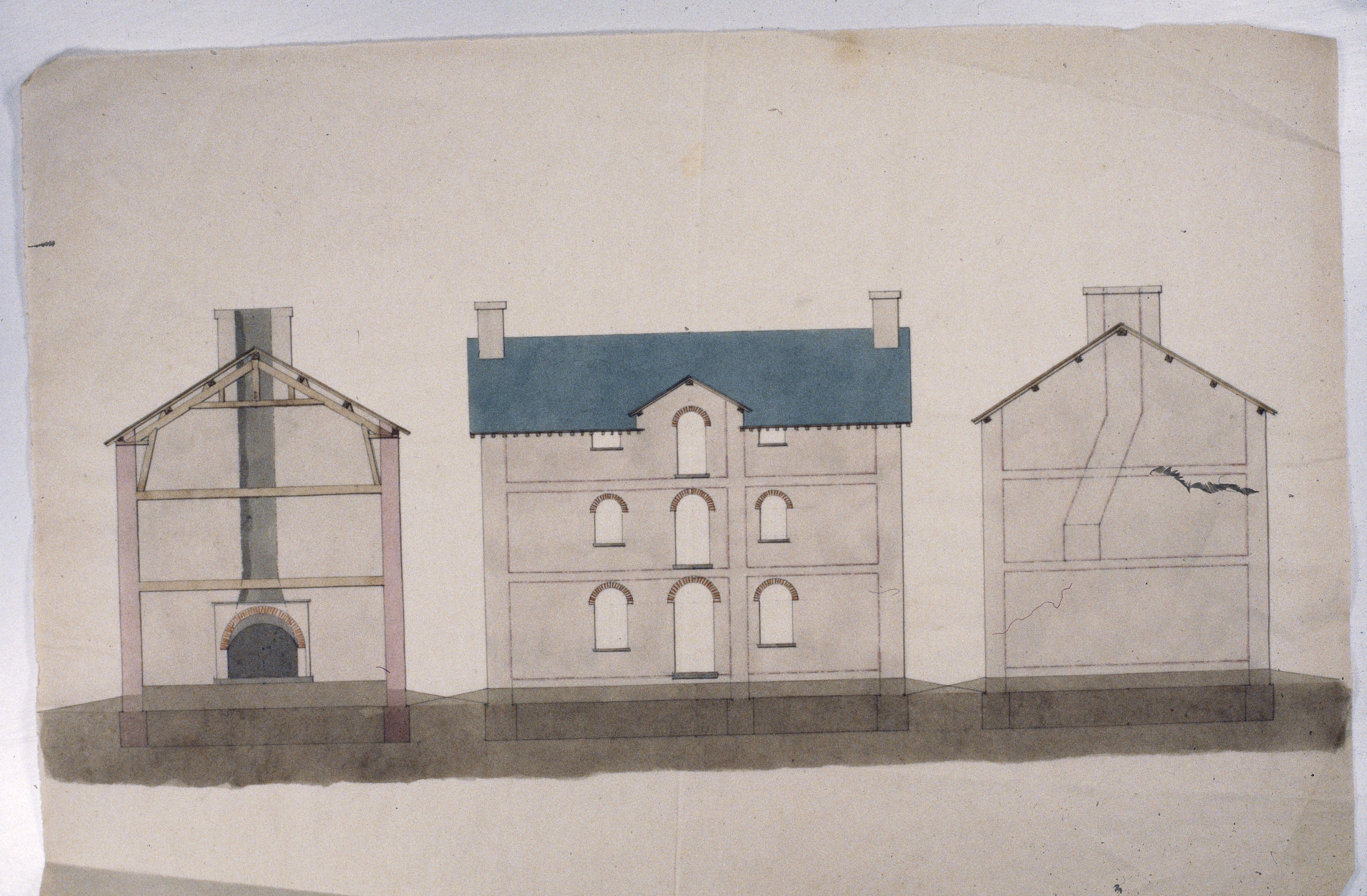 Plan en coupe, plan d'élévation de la façade, plan d'élévation du pignon du logement de la ferme de la Porte au château de LargentayeImmatriculation