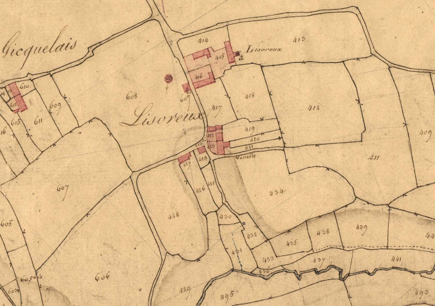 Extrait du cadastre ancien de 1827, manoir de Lisoreux, feuille I2Immatriculation