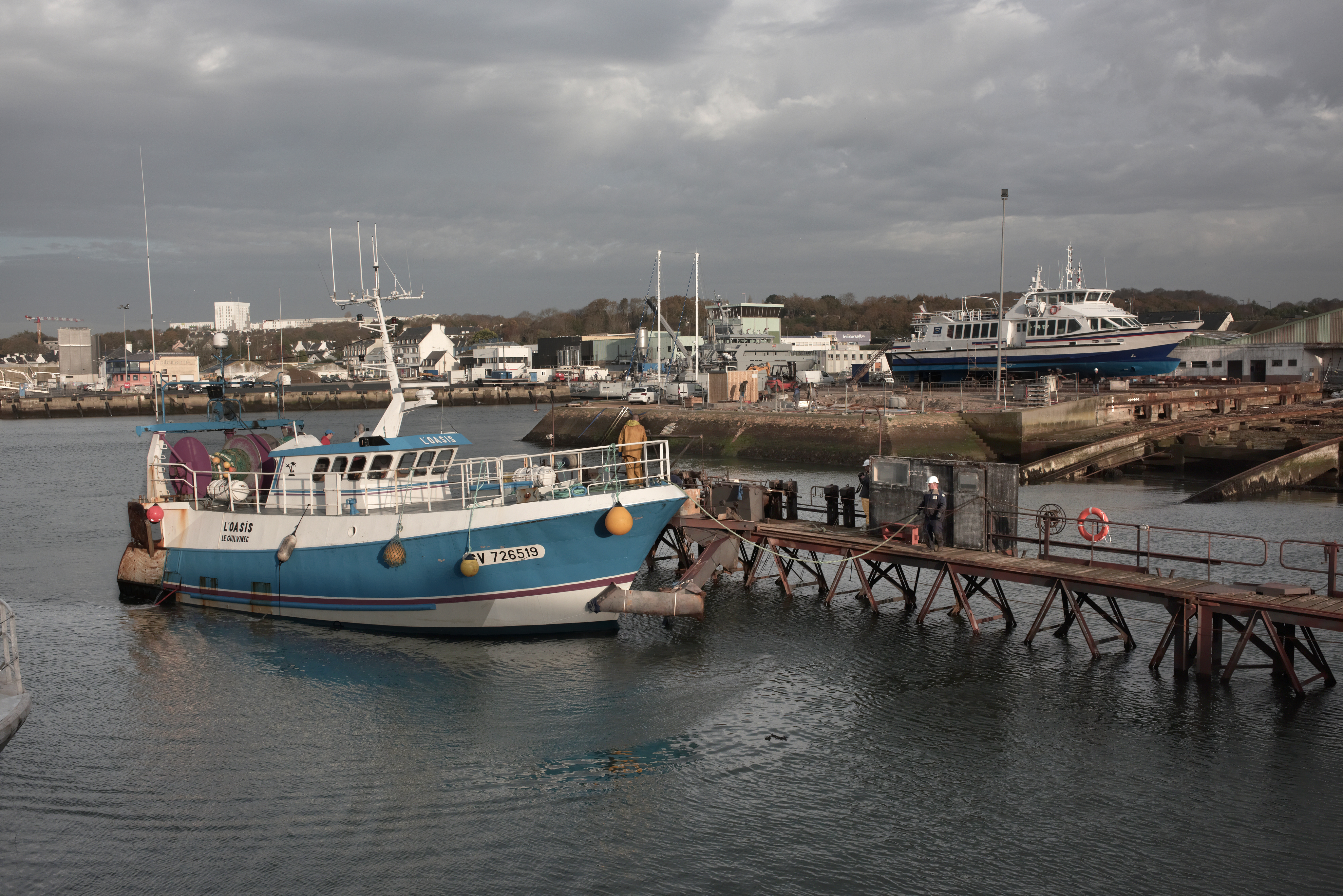 Bateau de pêche se positionnant pour être parallèle à la passerelle et centré pour être bloqué par le brasImmatriculation