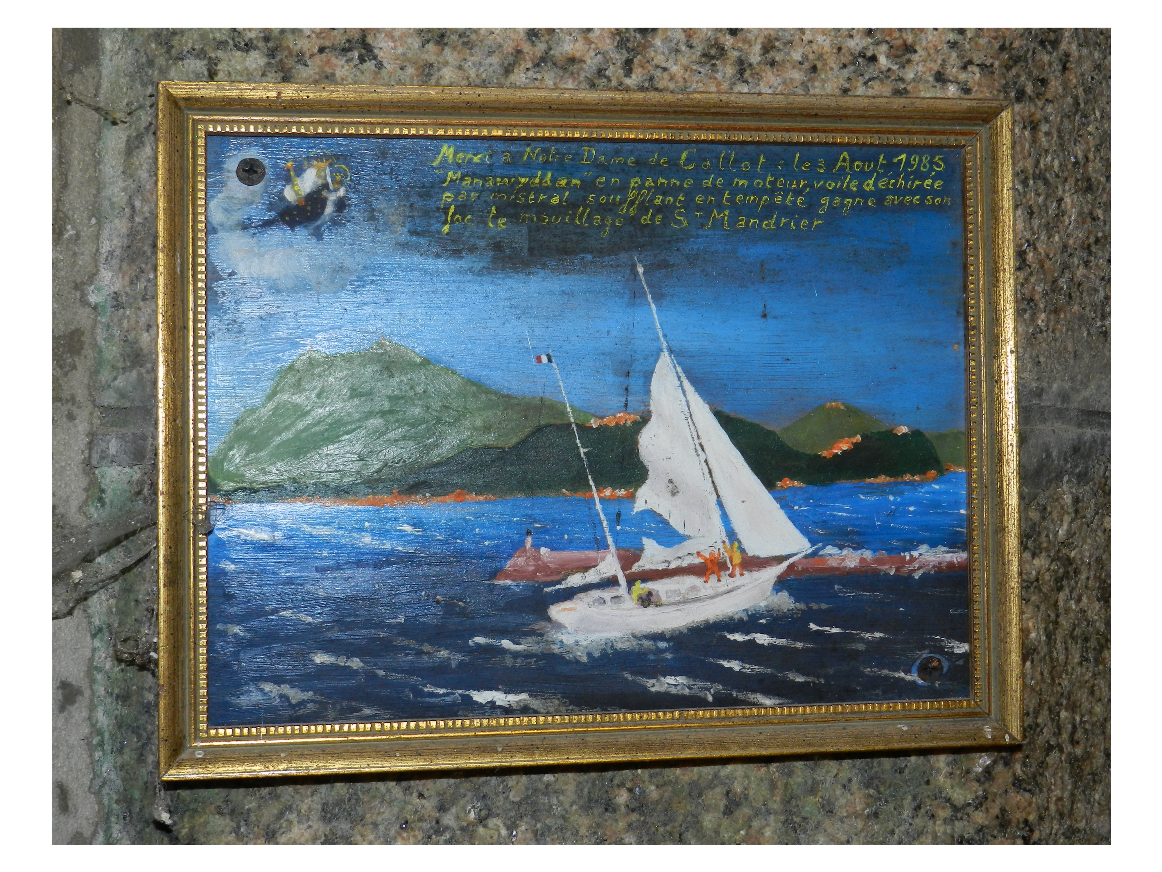 Tableau votif : "Merci à Notre-Dame de Callot : le 3 Août 1985/"Manawyddan(?) en panne de moteur, voile déchirée par mistral soufflant en tempête gagne avec son foc le mouillage de Saint Mandrier"Immatriculation