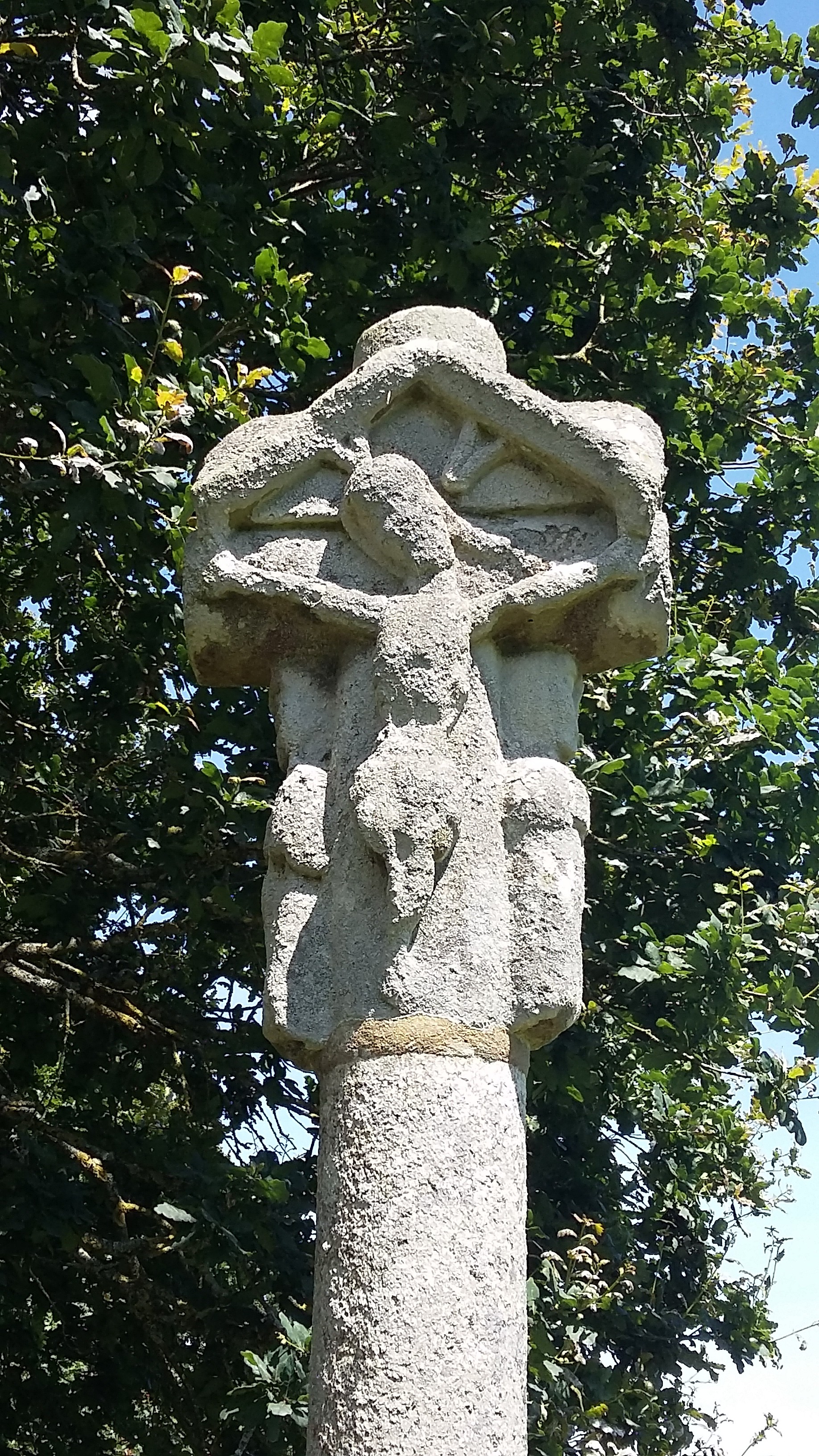 Croix de chemin de Gourmelan, partie supérieure : Christ en croix (état en 2016)Immatriculation