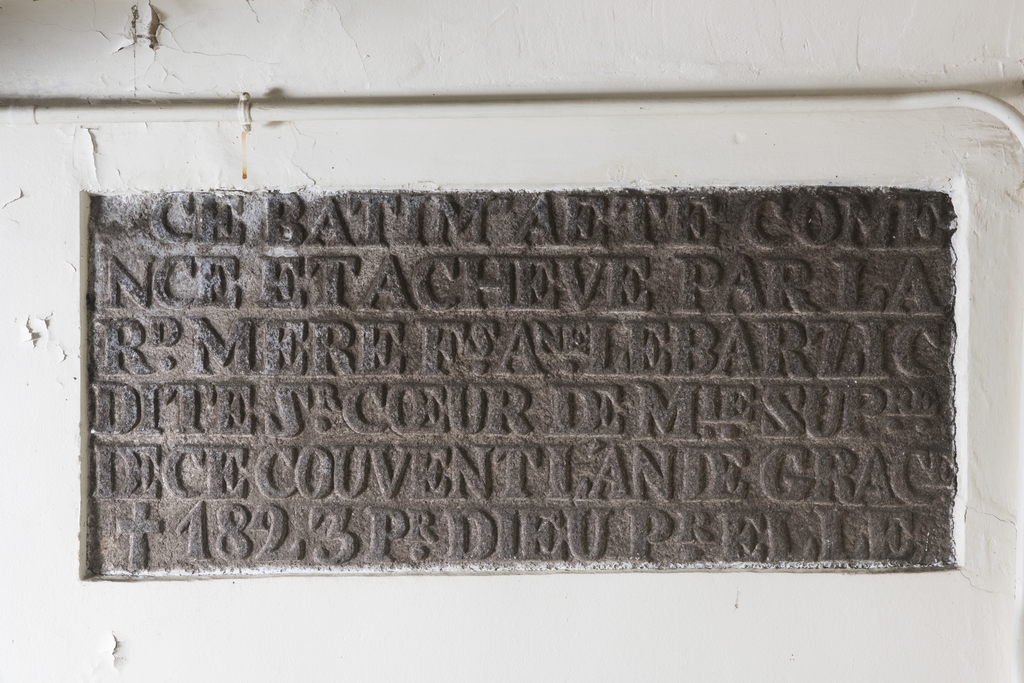 Corps de logis 19e siècle. Cage d'escalier. Pierre de fondation datée 1823Immatriculation