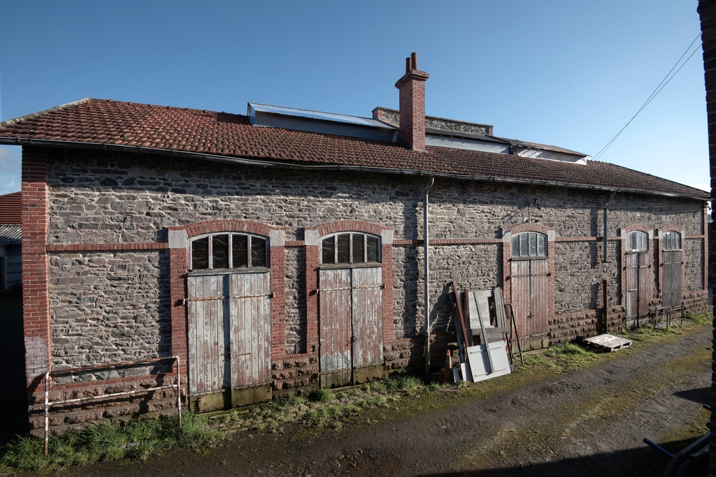 Tréguier, rue du Guindy : abattoir public municipal, façade postérieure de la halle. Cinq portes en bois à double battant permettaient l'entrée des animaux arrivant de l'étable dans les échaudoirs (lieux où l’on abat)Immatriculation