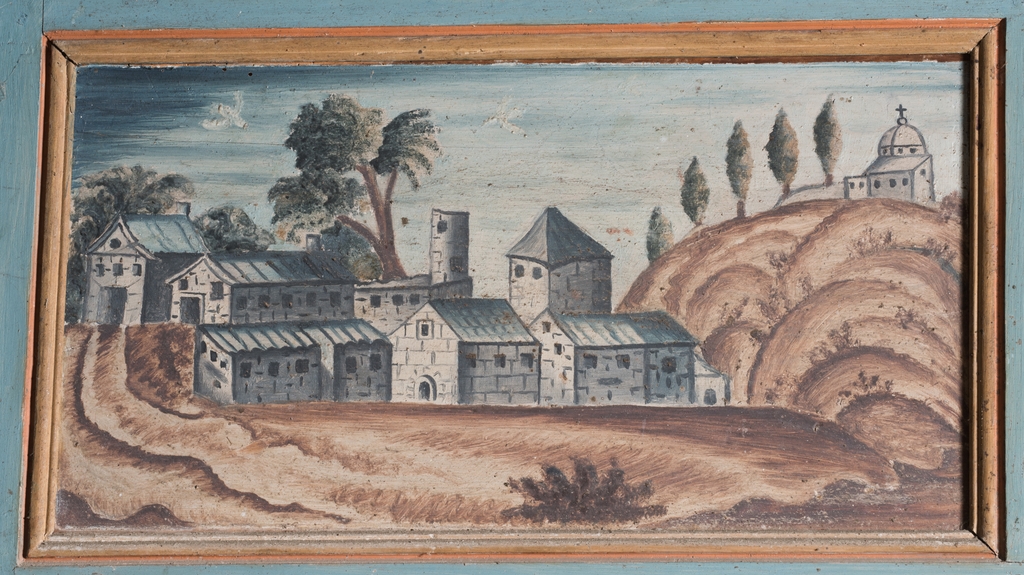 Ensemble de petits tableaux sur le pourtour du lambris de couvrement. DétailImmatriculation