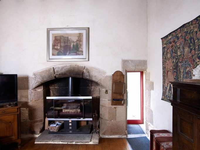 Tréguier, 22 rue Colvestre : manoir urbain dit "Maison de Jean V", premier étage, grande pièce nord identifiée comme "chambre noble" (cheminée encastrée dans le mur nord et porte des latrines). A signaler, le manteau en arc segmentaire en trois claveaux et le chanfrein droit très large des piédroitsImmatriculation