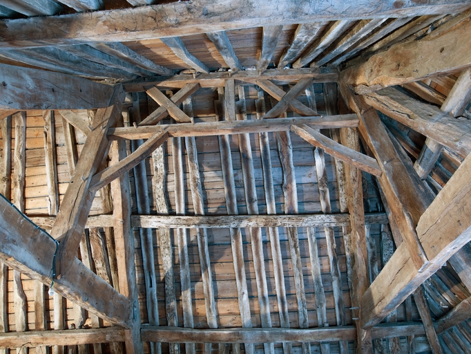 Tréguier, 22 rue Colvestre : manoir urbain dit "Maison de Jean V", étage de combles - autrefois "salle haute sous charpente" (plancher créé ultérieurement), détail de la charpenteImmatriculation