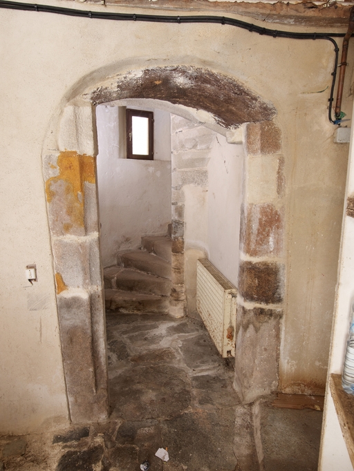 Tréguier, 13 rue Colvestre : manoir urbain dit "Maison des Trois Avocats", rez-de-chaussée, porte menant à l'escalier en visImmatriculation