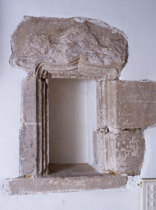Tréguier, 13 rue Colvestre : manoir urbain dit "Maison des Trois Avocats", premier étage, aile en retour d'équerre vers le sud, détail de l'armoire murale au décor gothique flamboyant (martelé)Immatriculation