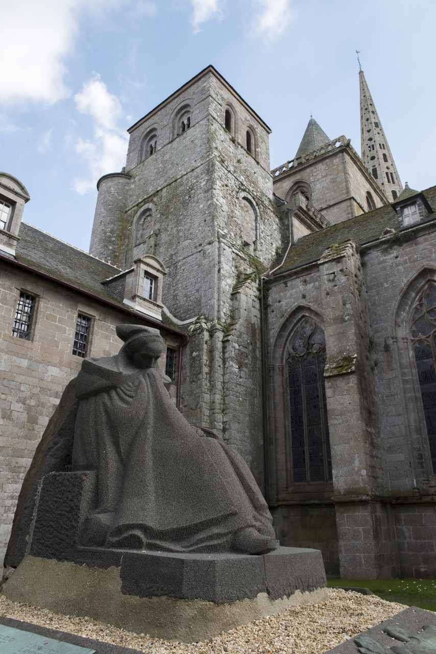 Tréguier, Place du Général Leclerc : monument aux morts. En arrière-plan, la cathédrale Saint-Tugdual et la tour HastingImmatriculation