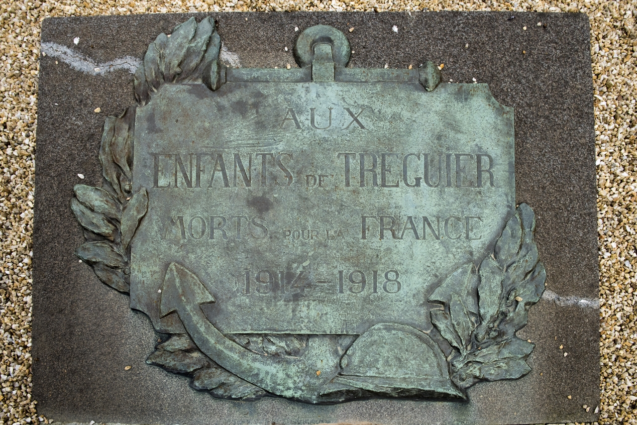 Tréguier, Place du Général Leclerc : monument aux morts, plaque de bronze située au sol ornée d'une guirlande de laurier, d'une ancre de marine et d'un casque. On peut lire : "Aux / enfants de Tréguier / morts pour la France / 1914-1918"Immatriculation