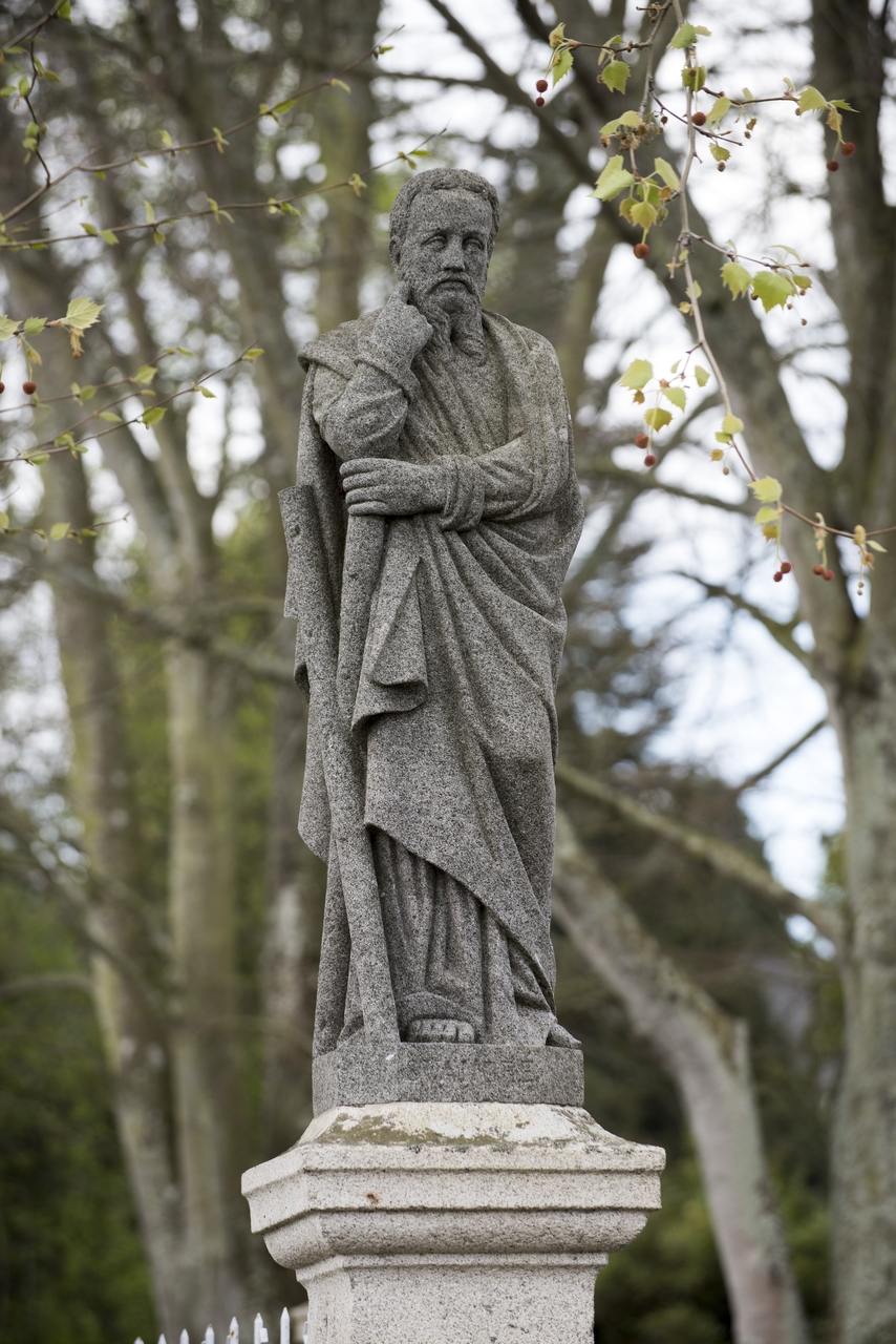 Tréguier, rue Marcellin Berthelot - Parc de la Baronnais : calvaire de Réparation, détail de la statue de saint André avec ses attributs (grande croix à branches égales de son martyr, dite croix de saint André)Immatriculation