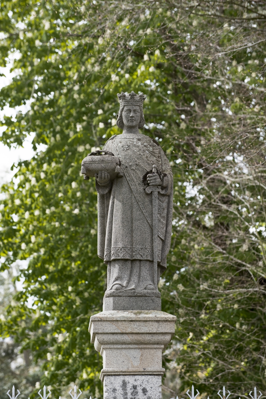 Tréguier, rue Marcellin Berthelot - Parc de la Baronnais : calvaire de Réparation, détail de la statue de saint Louis avec ses attributs (expression mélancolique, couronne, épée, fleur de lys...)Immatriculation