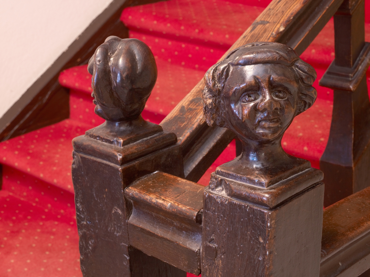 Tréguier, 5 Place du Général de Gaulle : Hôtel de l'Estuaire, détail de l'escalier sculpté, têtes humainesImmatriculation