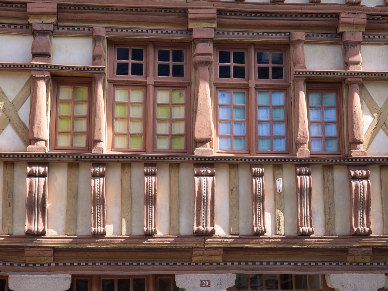 Façade nord. Détail de la façade en pan de bois, en encorbellement au décor de colonnettes et de hautes palmettesImmatriculation