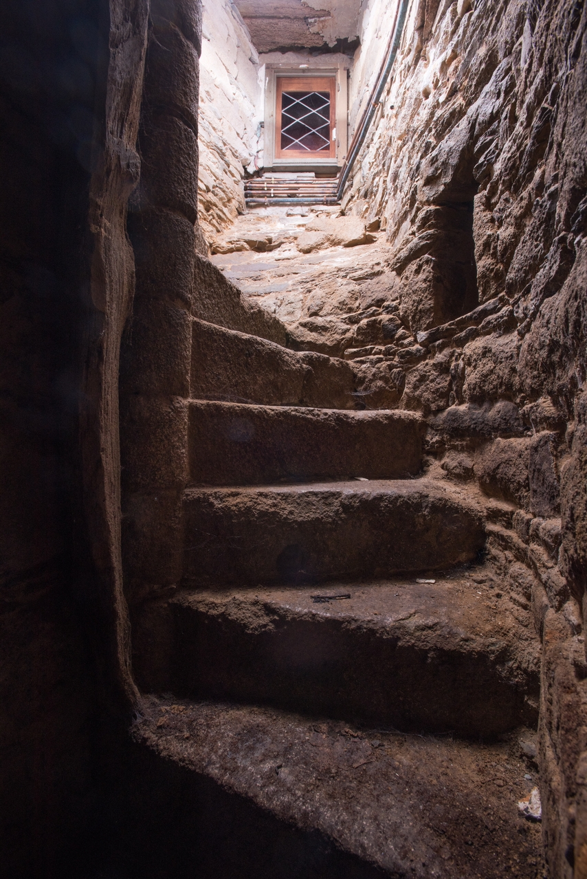 Descente de cave. Escalier en vis éclairé par un jour et une niche à lumièreImmatriculation