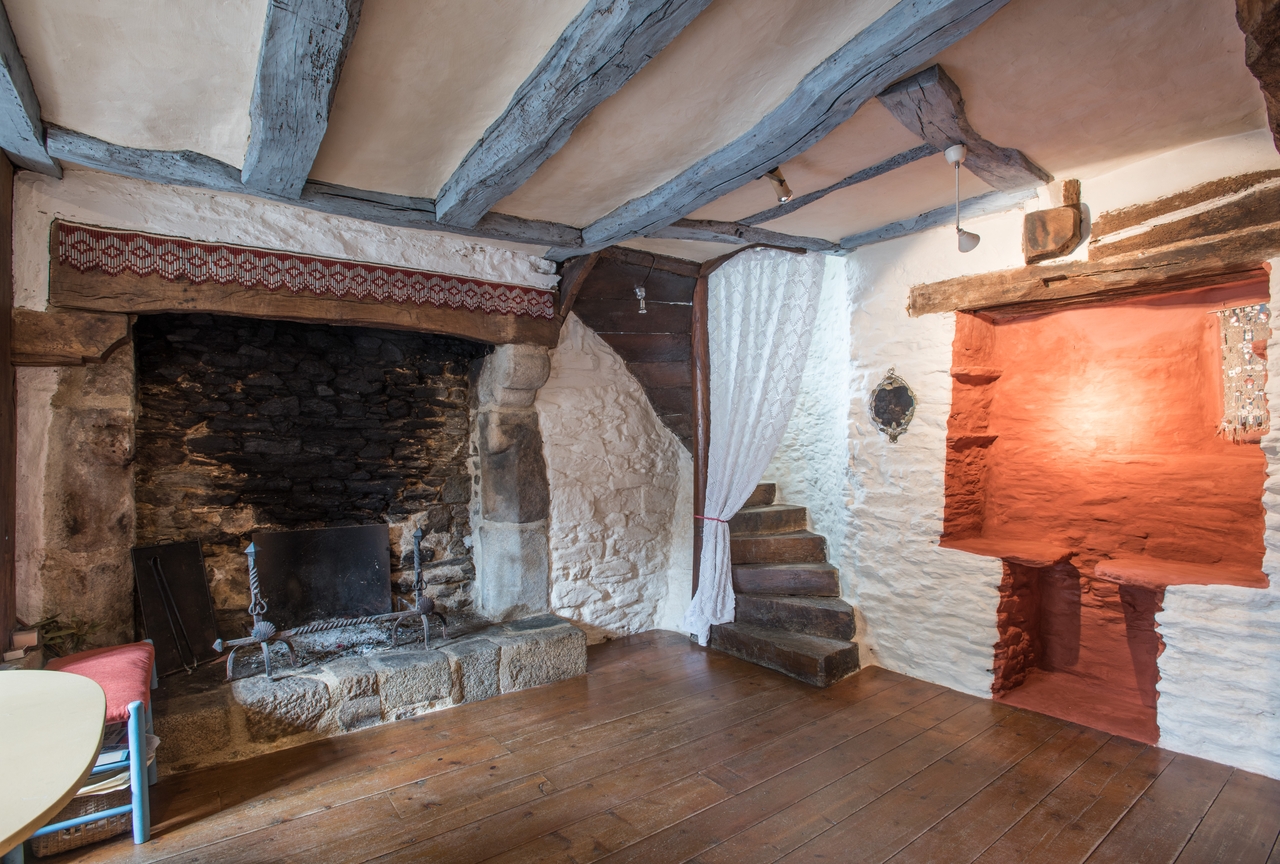 Salle du rez-de-chaussée avec cheminée, escalier en vis et placard mural. Vue généraleImmatriculation
