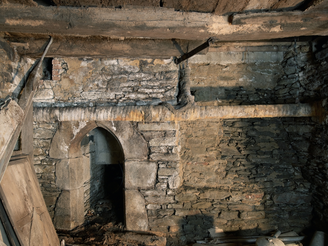 Sous-sol. Angle sud. Petite porte d'accès à un escalier secondaire intégré au gros oeuvre du murImmatriculation