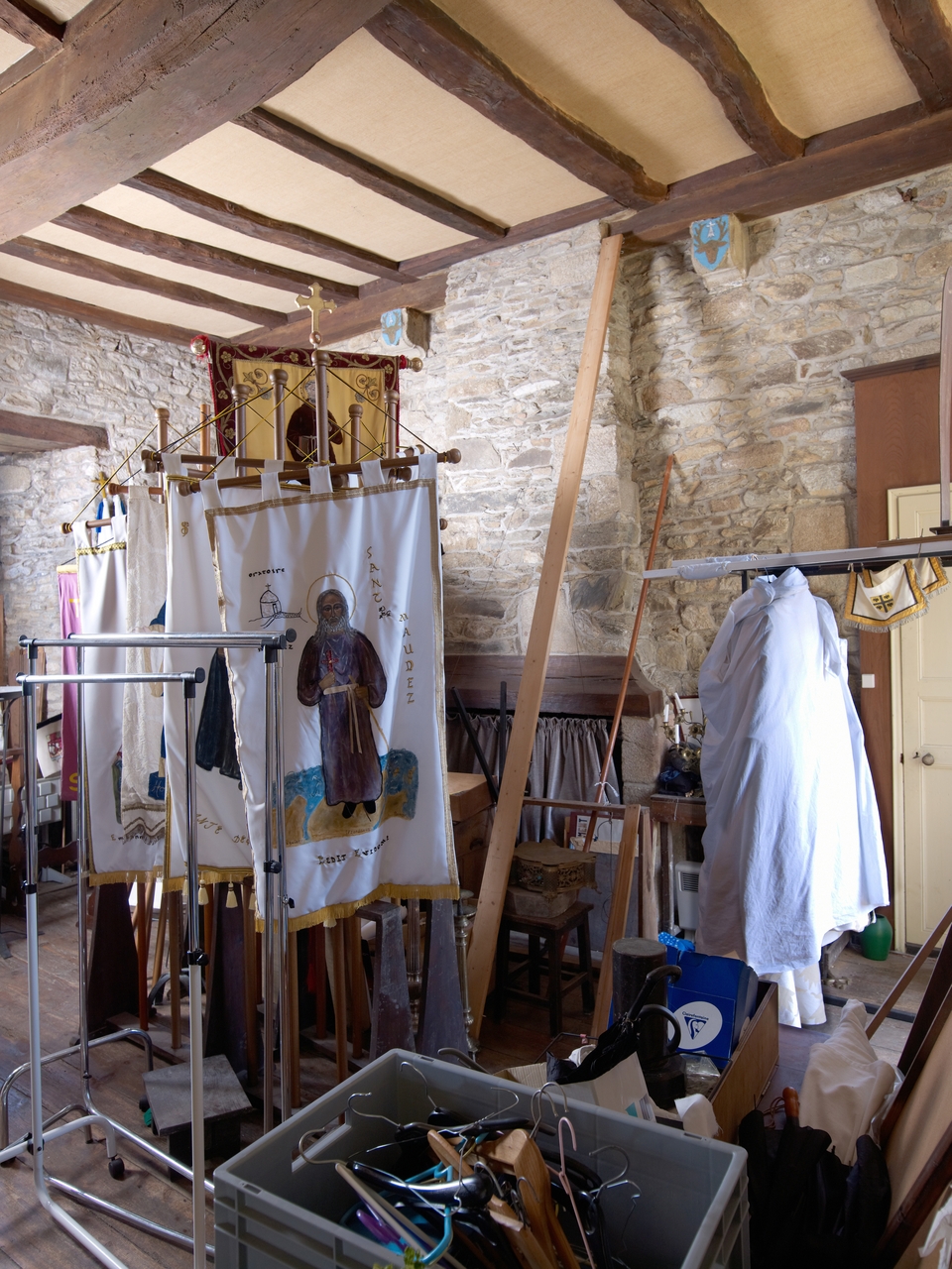 Tréguier : sacristie de la cathédrale Saint-Tugdual, aile sud-est, premier étage, pièce avec cheminée communicant avec l'escalier au nord et la sacritie au sudImmatriculation