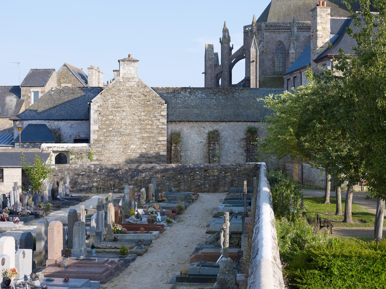 Tréguier : cloître de la cathédrale, mur extérieur nord flanqué de contreforts. Au premier plan, le cimetière Saint-FiacreImmatriculation