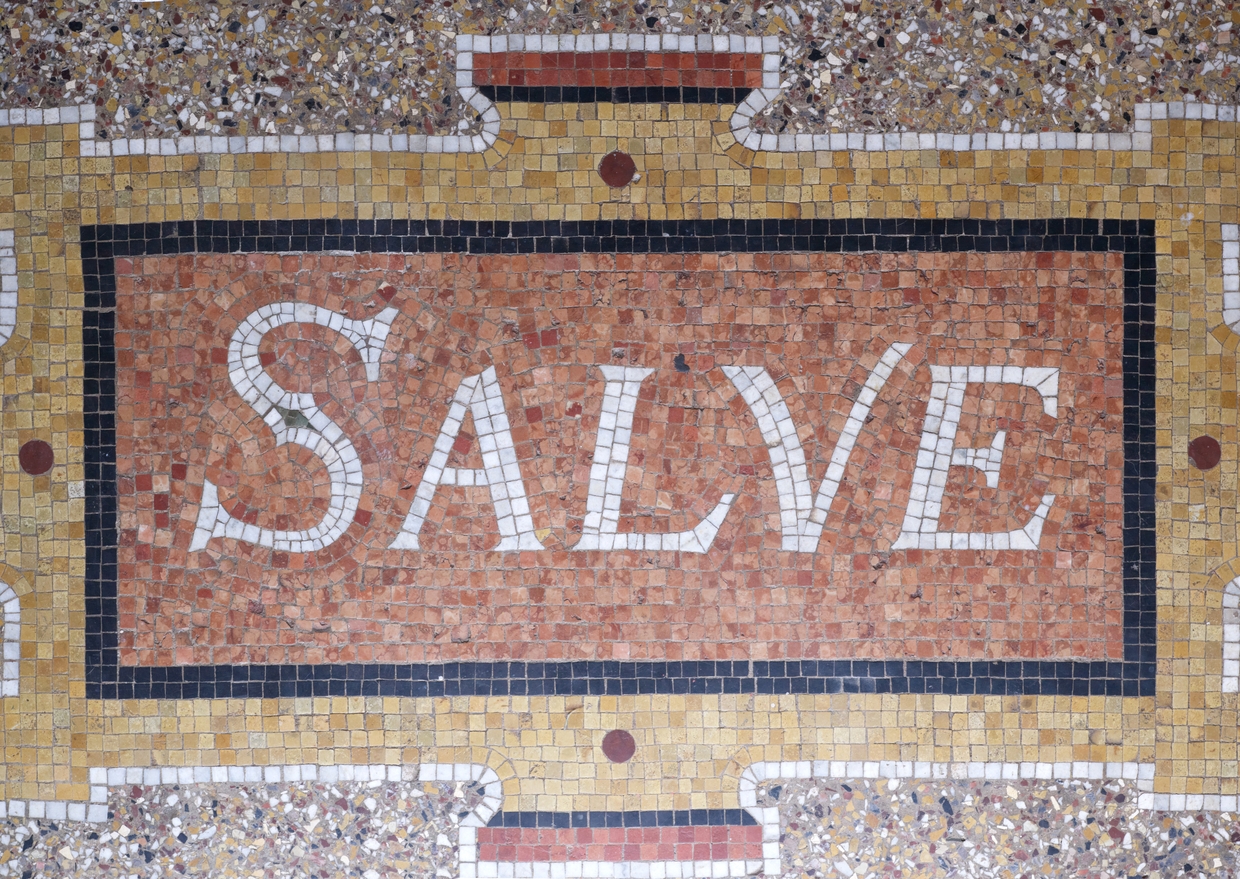 Jardin d'hiver. Sol en granito et mosaïque de marbre. Détail de l'inscription en mosaïqueImmatriculation