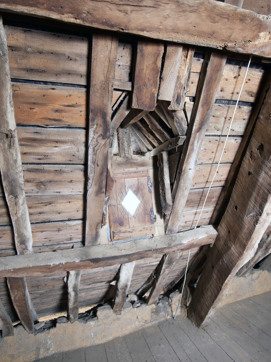 Tréguier, 26 rue Colvestre : maison à pan de bois, étage de comble, petite lucarne, vue intérieureImmatriculation