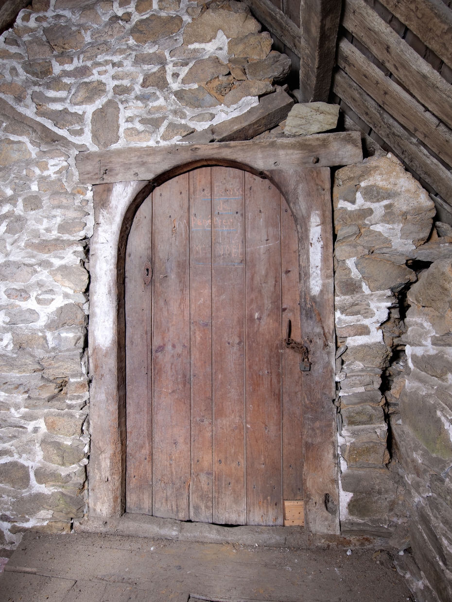Tréguier, 26 rue Colvestre : maison à pan de bois, porte en arc plein cintre en bois donnant à l'étage de combleImmatriculation