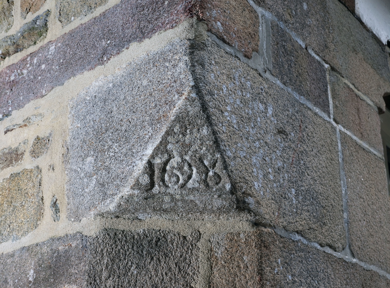 Tréguier, 26 rue Colvestre : maison à pan de bois, détail de l'angle des rues Colvestre et Saint-François, pan coupé daté 1628 (?)Immatriculation