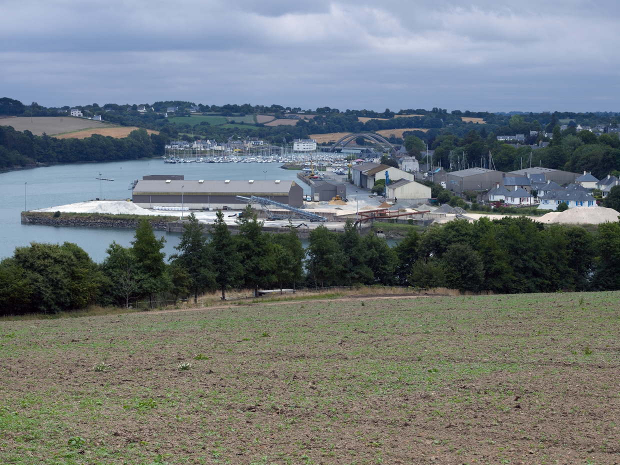 Tréguier : port de commerce et lotissement du Gollot depuis Plouguiel. En arrière plan, le port de plaisance et le pont CanadaImmatriculation