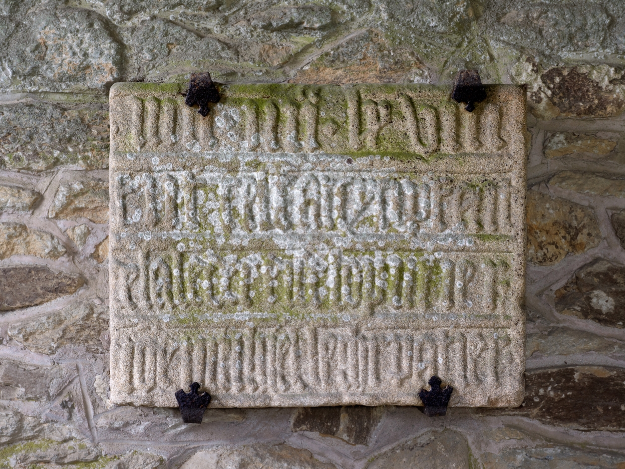 Tréguier : cloître de la cathédrale, galerie ouest, inscription gothique, fragment de dalle funéraire (?)Immatriculation
