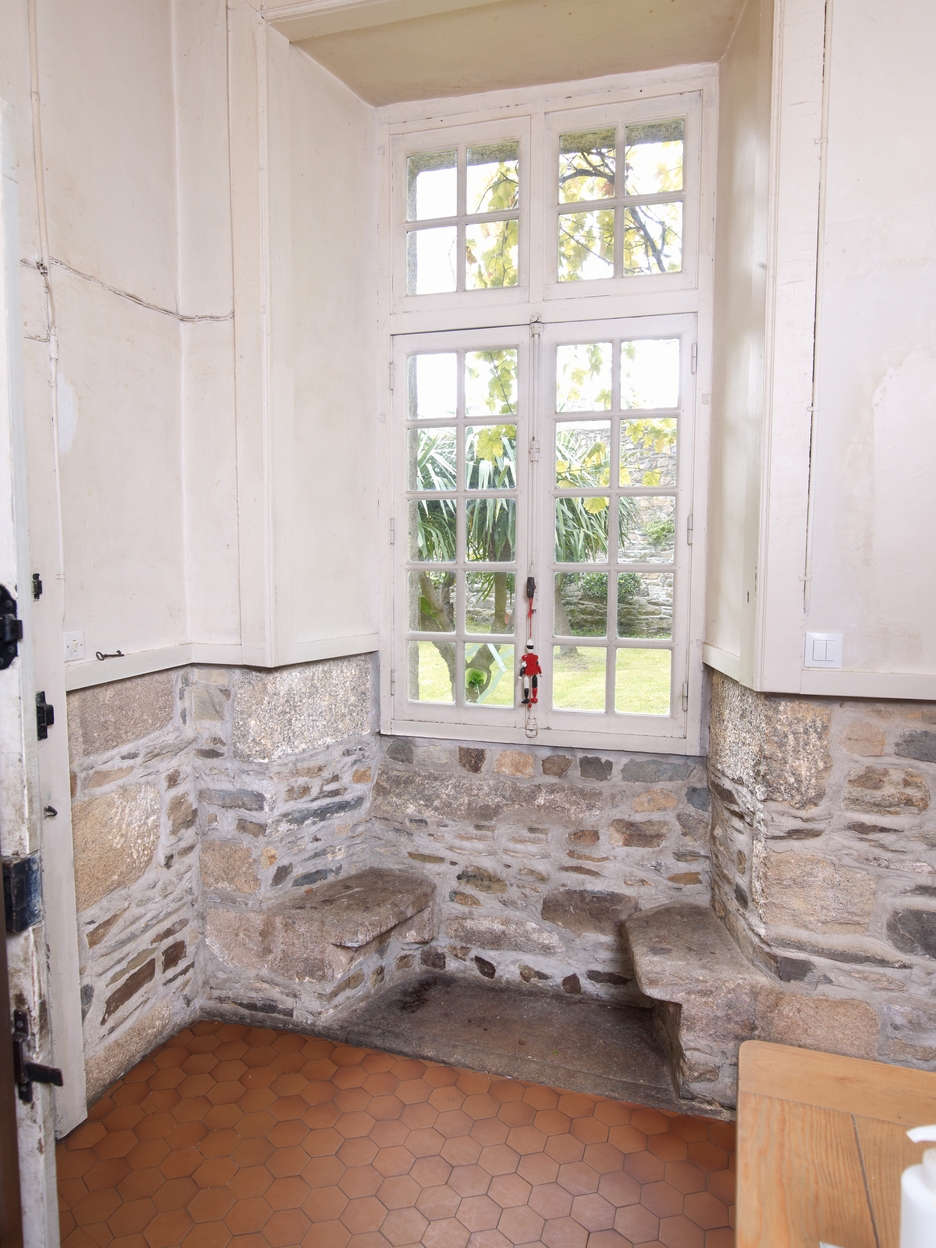 Tréguier, 11 rue du Port : maison d'armateur ou de négociant, premier étage, pièce côté jardin, fenêtre à coussièges et pierre d'évier de la cuisine (remploi)Immatriculation