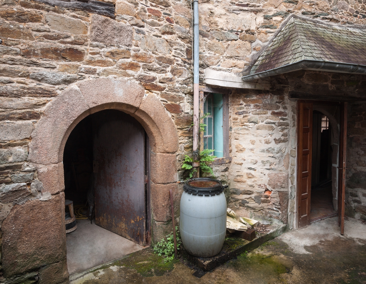 Tréguier, 15 rue Colvestre : maison à pan de bois rouge, aile sud sur cour, porte en arc plein cintre (2e moitié 16e siècle)Immatriculation