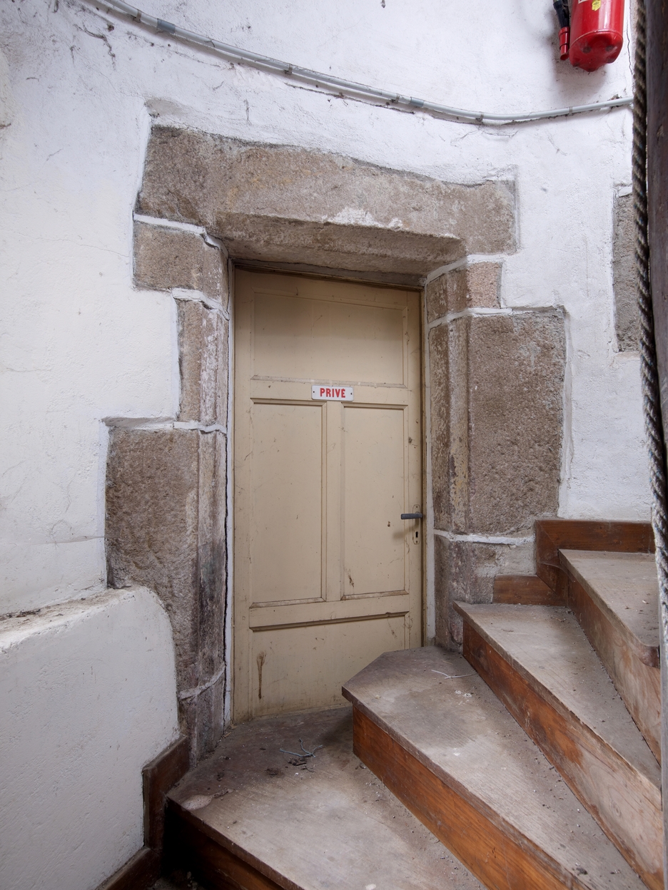 Tréguier, 15 rue Colvestre : maison à pan de bois rouge, tour d'escalier, escalier en vis et porte du palier (donnant sur l'aile sud)Immatriculation