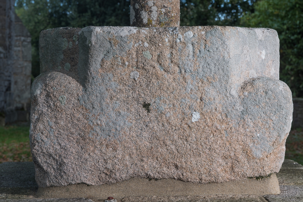Croix de la chapelle. Détail du socle, inscription illisibleImmatriculation