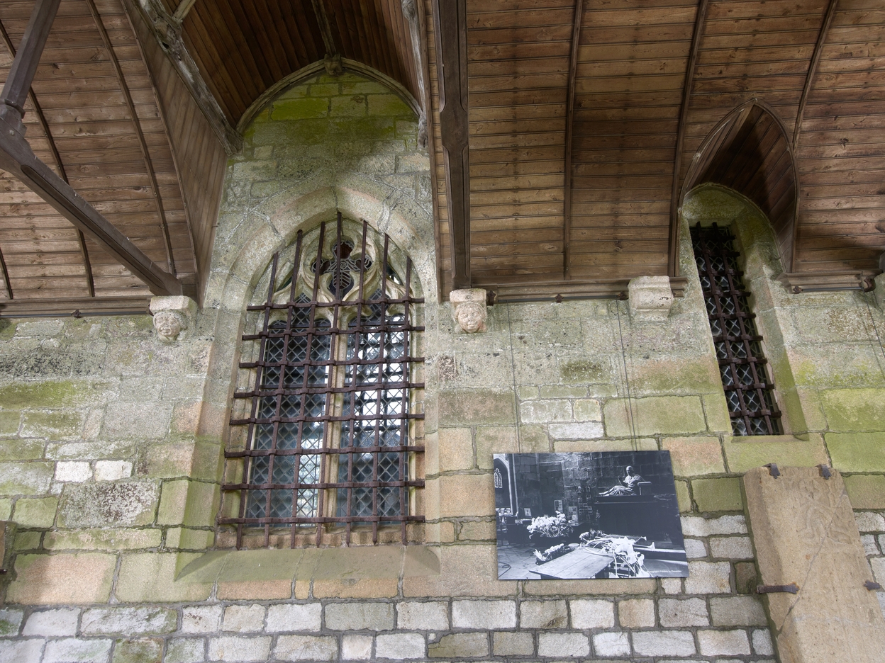 Tréguier : intérieure de la galerie ouest du cloître, détail des baies grillées de la sacristie faisant chapelle au rez-de-chaussée. Côté cour centrale, une grande lucarne éclaire en deuxième jour ces ouverturesImmatriculation