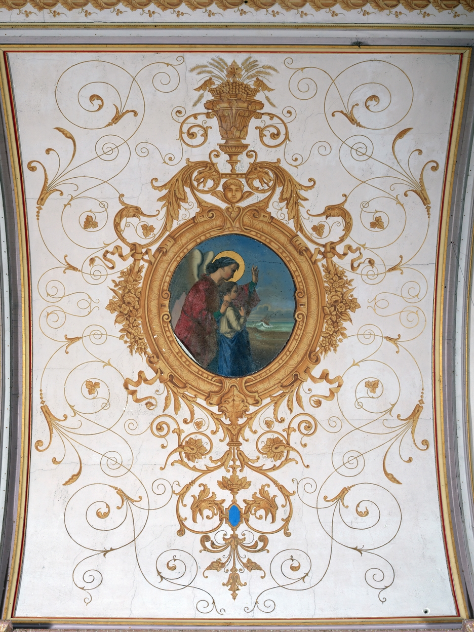 Nef des fidèles. Voûte. Détail d'un médaillon : l'Ange Raphaël protecteur de Tobie, daté 1871, signé J.HERLIDOImmatriculation