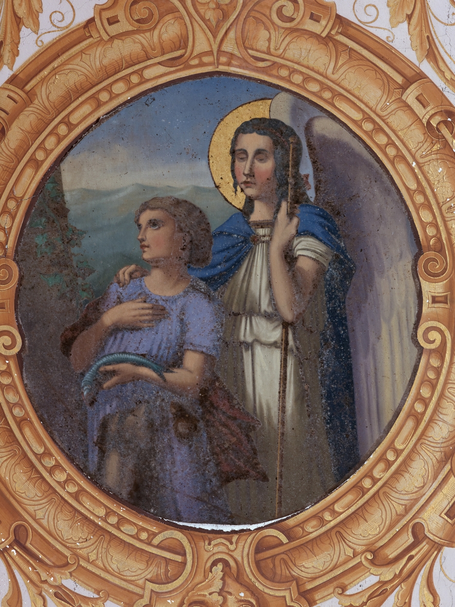 Nef des fidèles. Voûte. Détail d'un médaillon : Tobie, daté 1871, signé J.HERLIDOImmatriculation