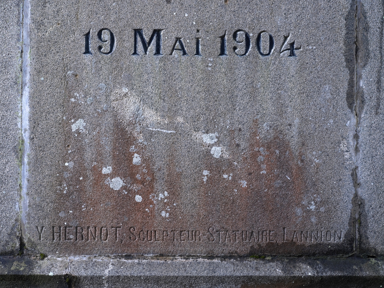 Tréguier, rue Marcellin Berthelot - Parc de la Baronnais : calvaire de Réparation, détail du socle, côté nord, millésime et signature de l'auteur, "19 mai 1904 / Y. Hernot, Sculpteur et Statuaire, Lannion"Immatriculation