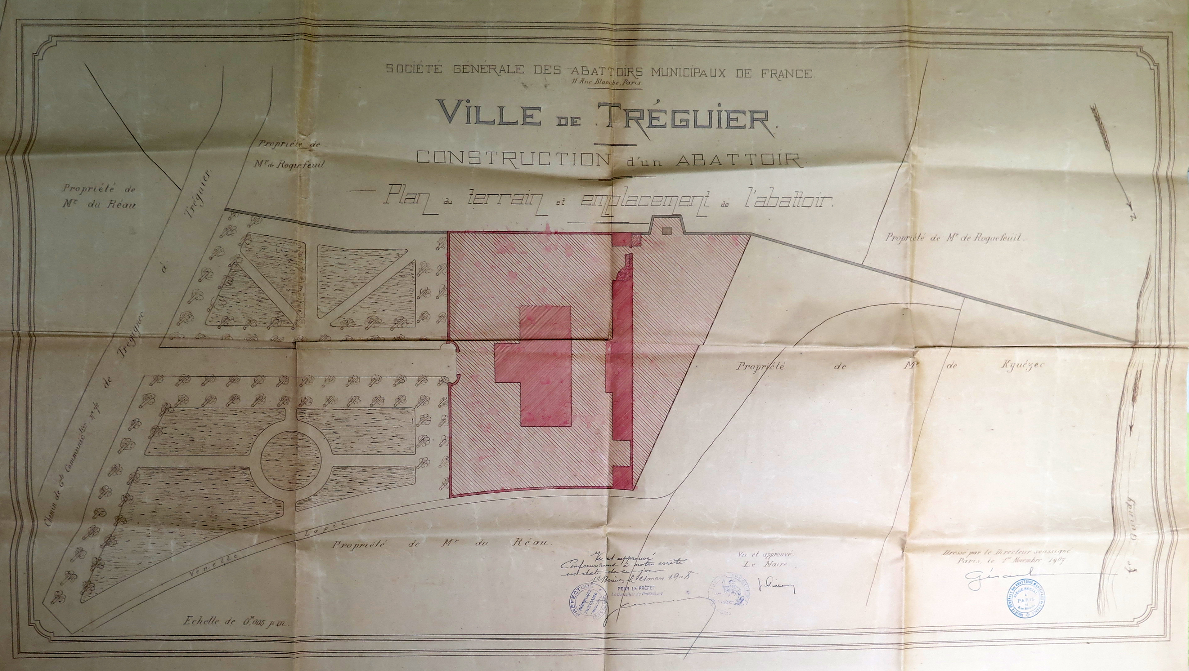 Tréguier, rue du Guindy : plan du terrain et emplacement de l'abattoir de la ville de Tréguier (plan de situation), 1er novembre 1907 (Archives municipales de Tréguier, 1M9)Immatriculation
