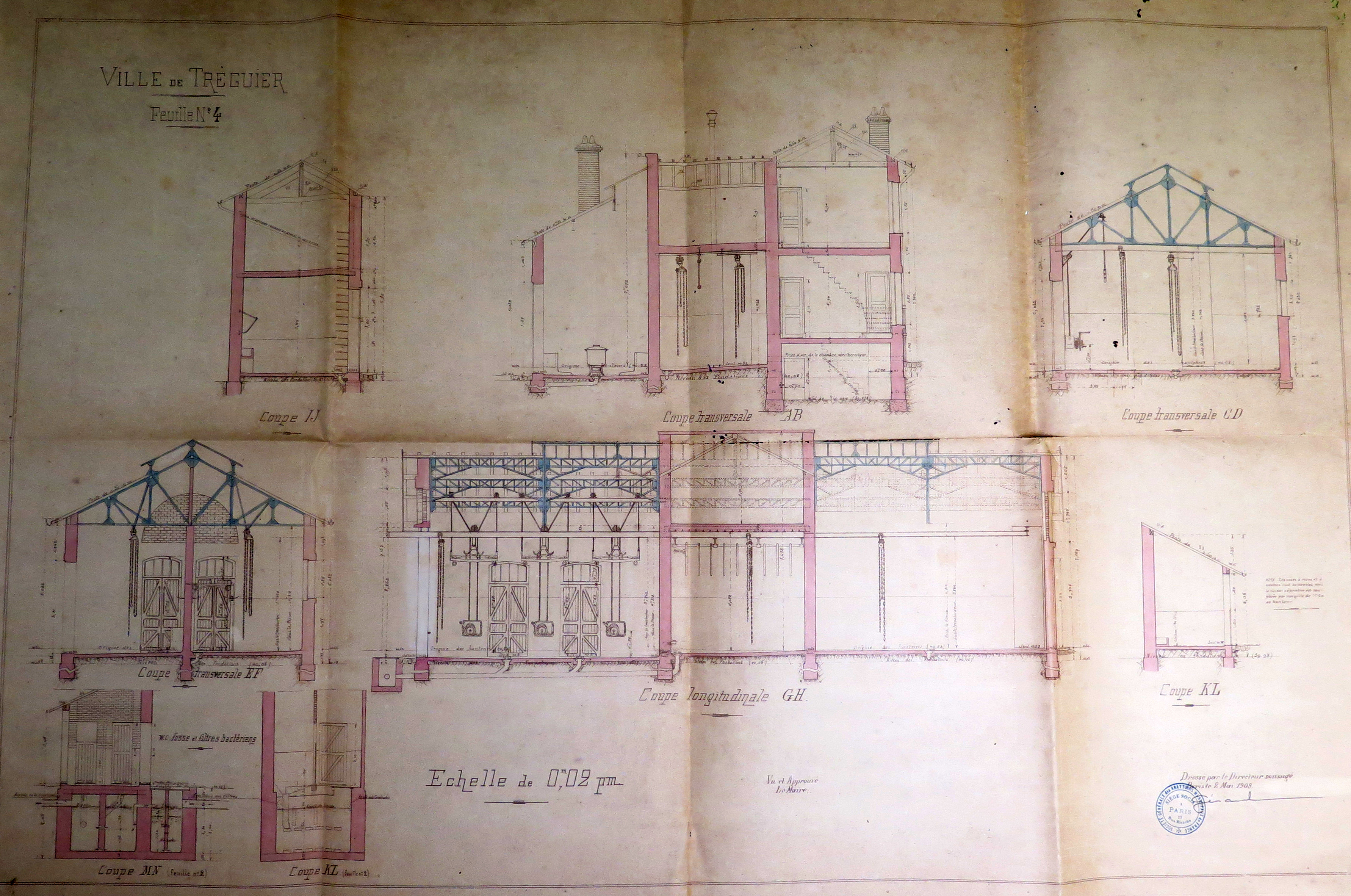 Tréguier, rue du Guindy : coupes (feuille n° 4) de l'abattoir de la ville de Tréguier, 2 mai 1908 (Archives municipales de Tréguier, 1M9)Immatriculation