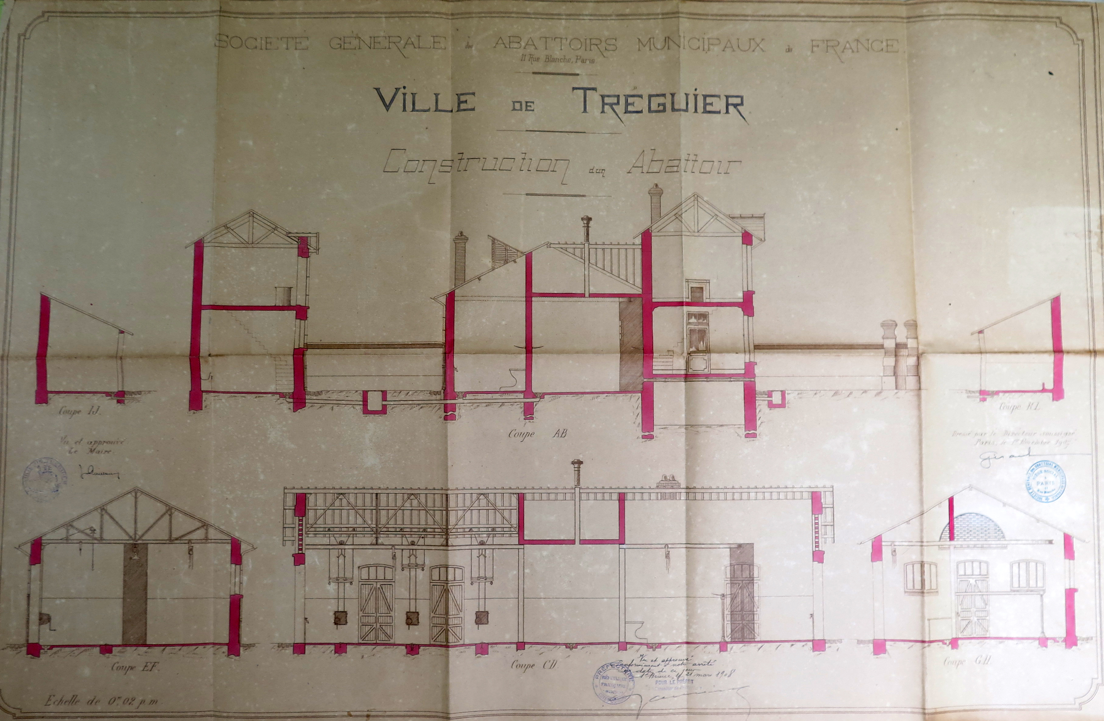 Tréguier, rue du Guindy : coupes de l'abattoir de la ville de Tréguier, 1er novembre 1907 (Archives municipales de Tréguier, 4F15)-