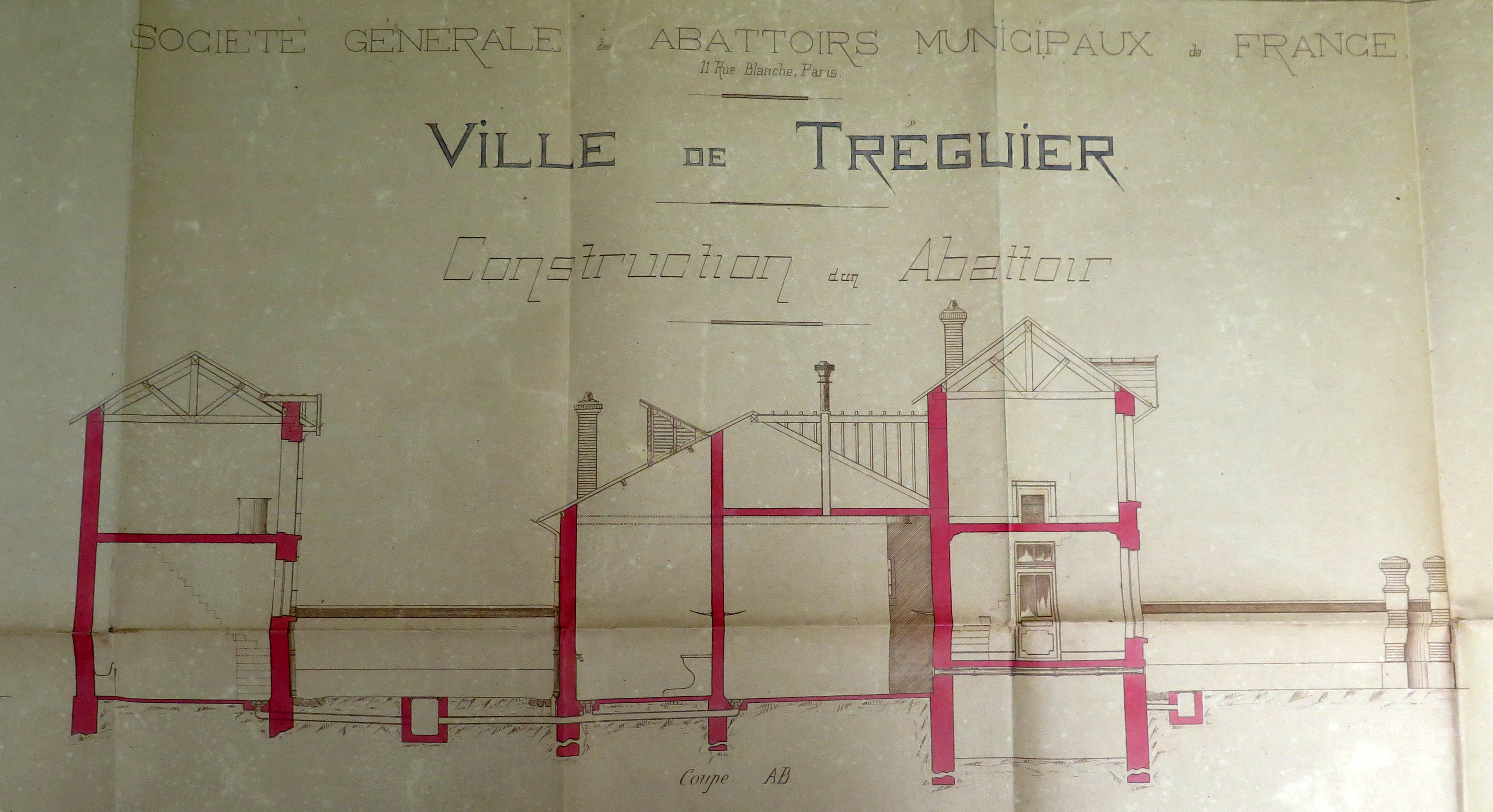Tréguier, rue du Guindy : détail des coupes de l'abattoir de la ville de Tréguier, 1er novembre 1907 (Archives municipales de Tréguier, 4F15)