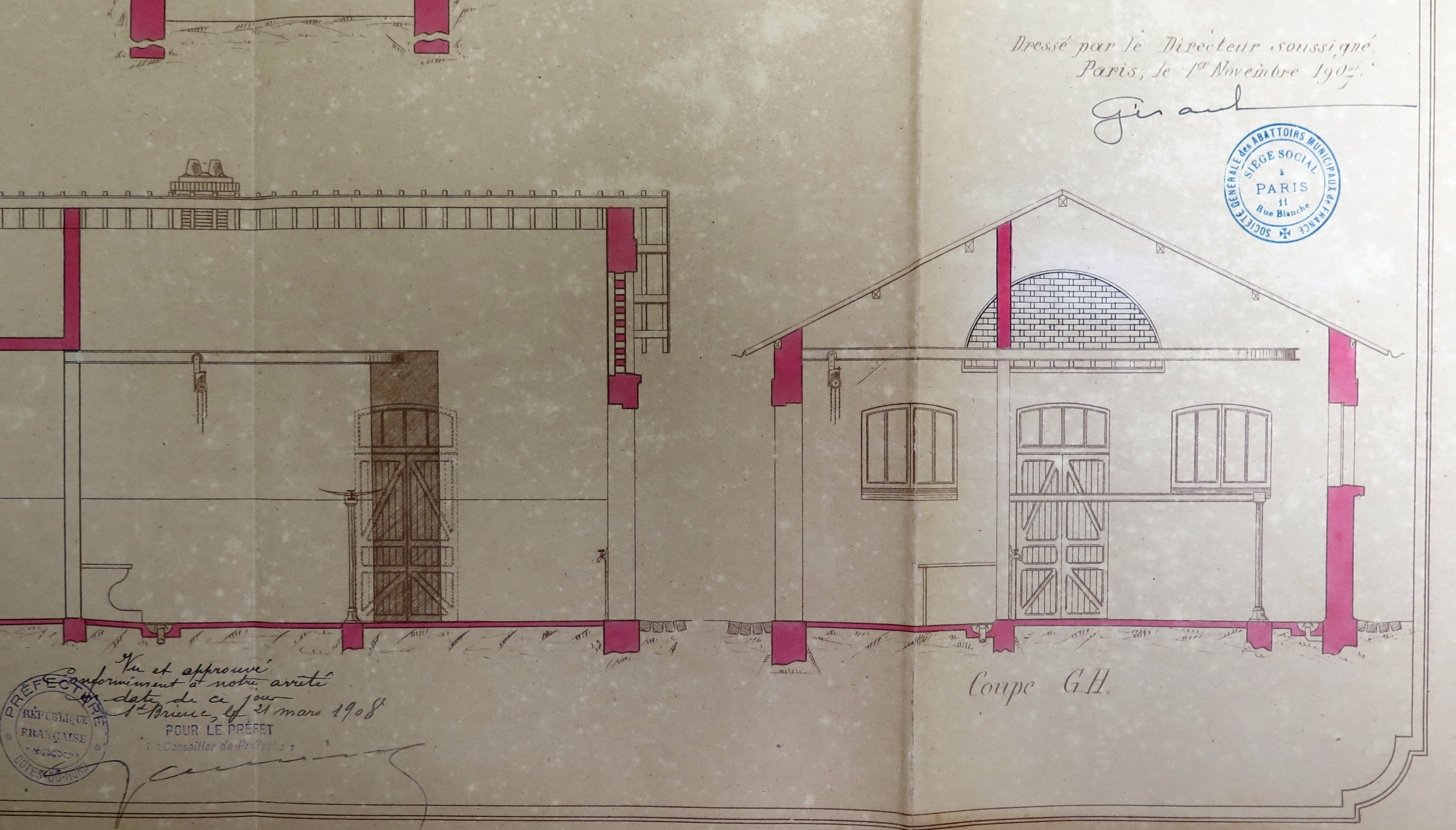 Tréguier, rue du Guindy : détail des coupes de l'abattoir de la ville de Tréguier, 1er novembre 1907 (Archives municipales de Tréguier, 4F15)