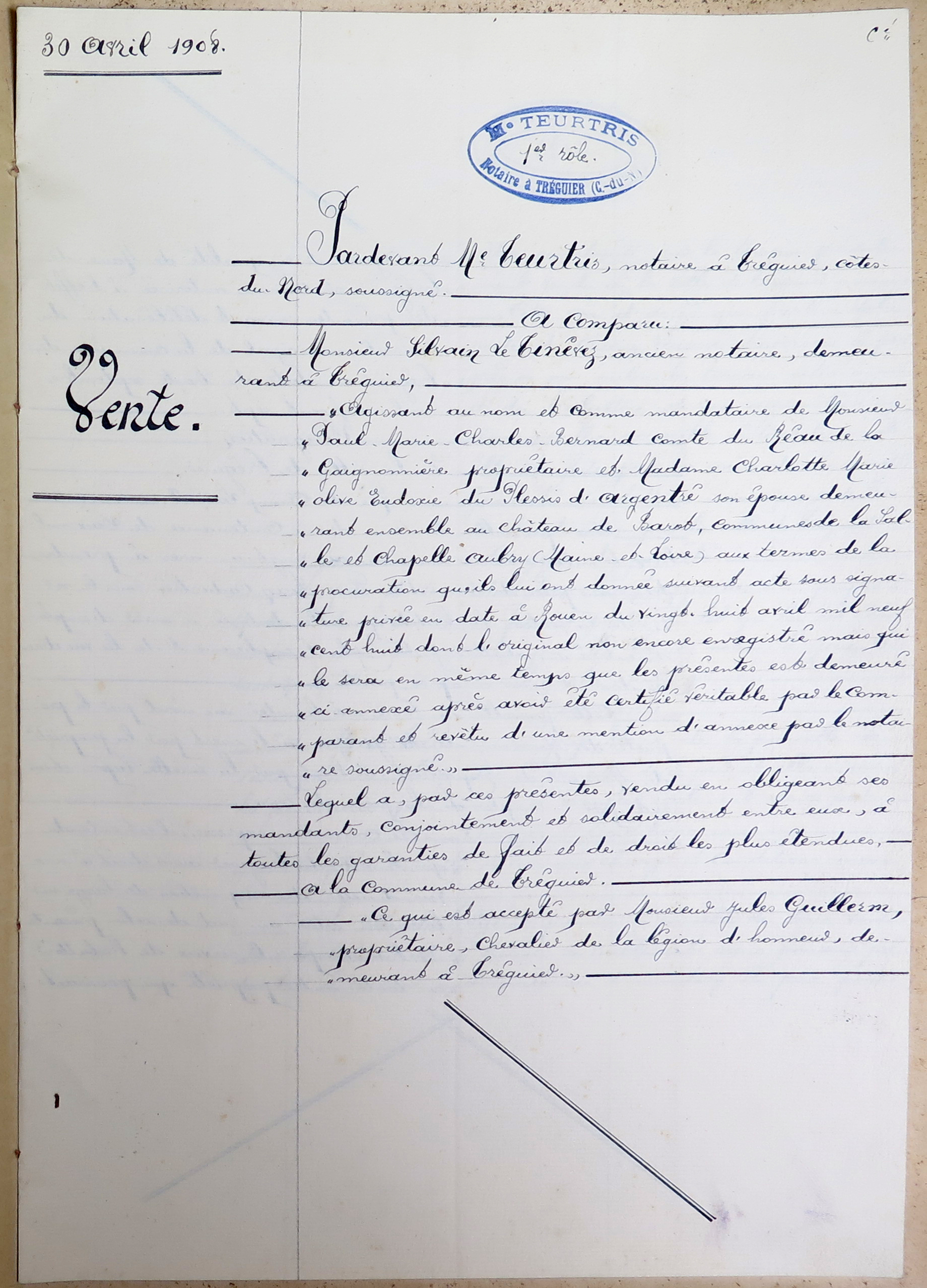 Tréguier, rue du Guindy : vente du terrain appelé Parc Bian d'une contenance de 21 ares (2100 m2) par la famille du Réau de la Gaignonnière à la ville de Tréguier afin d'y implanter l'abattoir public et la voie d'accès, 30 avril 1908 (Archives municipales de Tréguier, 4F15)