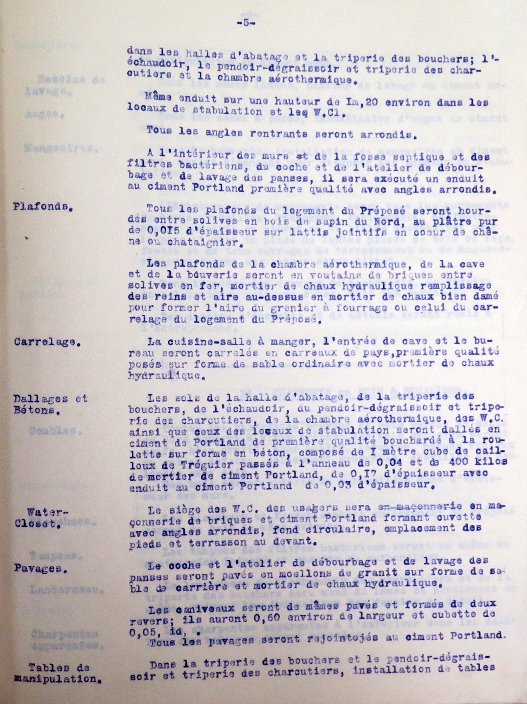 Tréguier, rue du Guindy : devis descriptif de l'abattoir de la ville de Tréguier par la Société générale des abattoirs municipaux de France, 1er novembre 1907, p. 5 (Archives municipales de Tréguier, 4F15)-