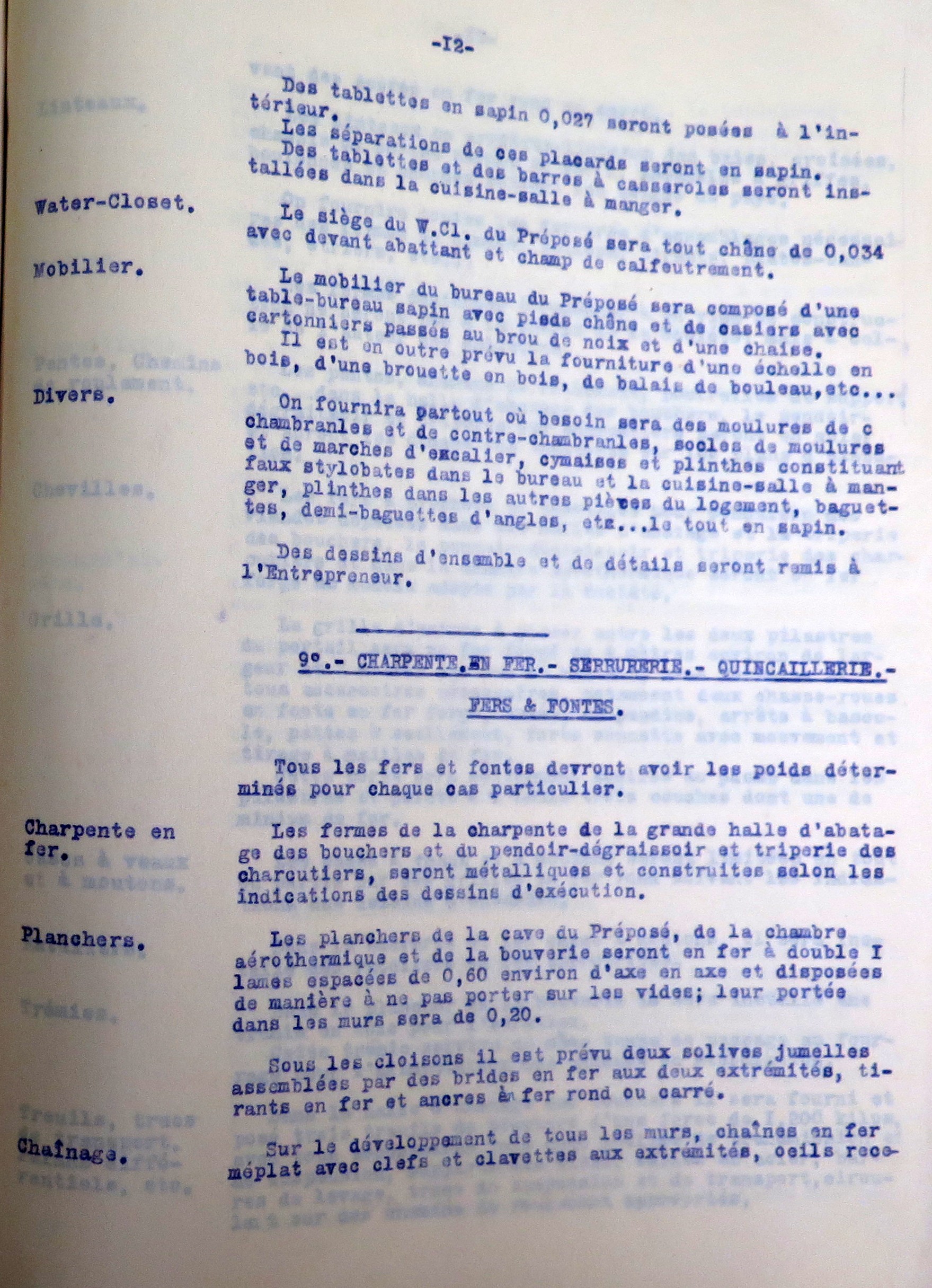 Tréguier, rue du Guindy : devis descriptif de l'abattoir de la ville de Tréguier par la Société générale des abattoirs municipaux de France, 1er novembre 1907, p. 12 (Archives municipales de Tréguier, 4F15)-